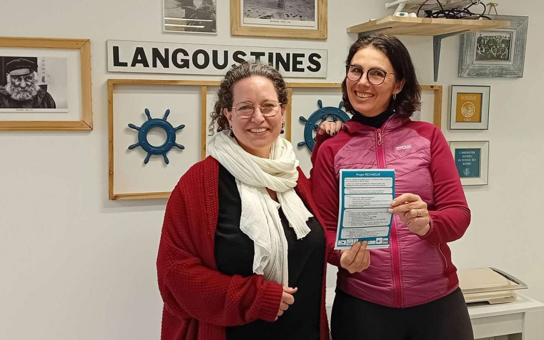 Le binôme menant les enquêtes présentant le flyer de présentation du projet relu par les marins__locaux de GLAZ
