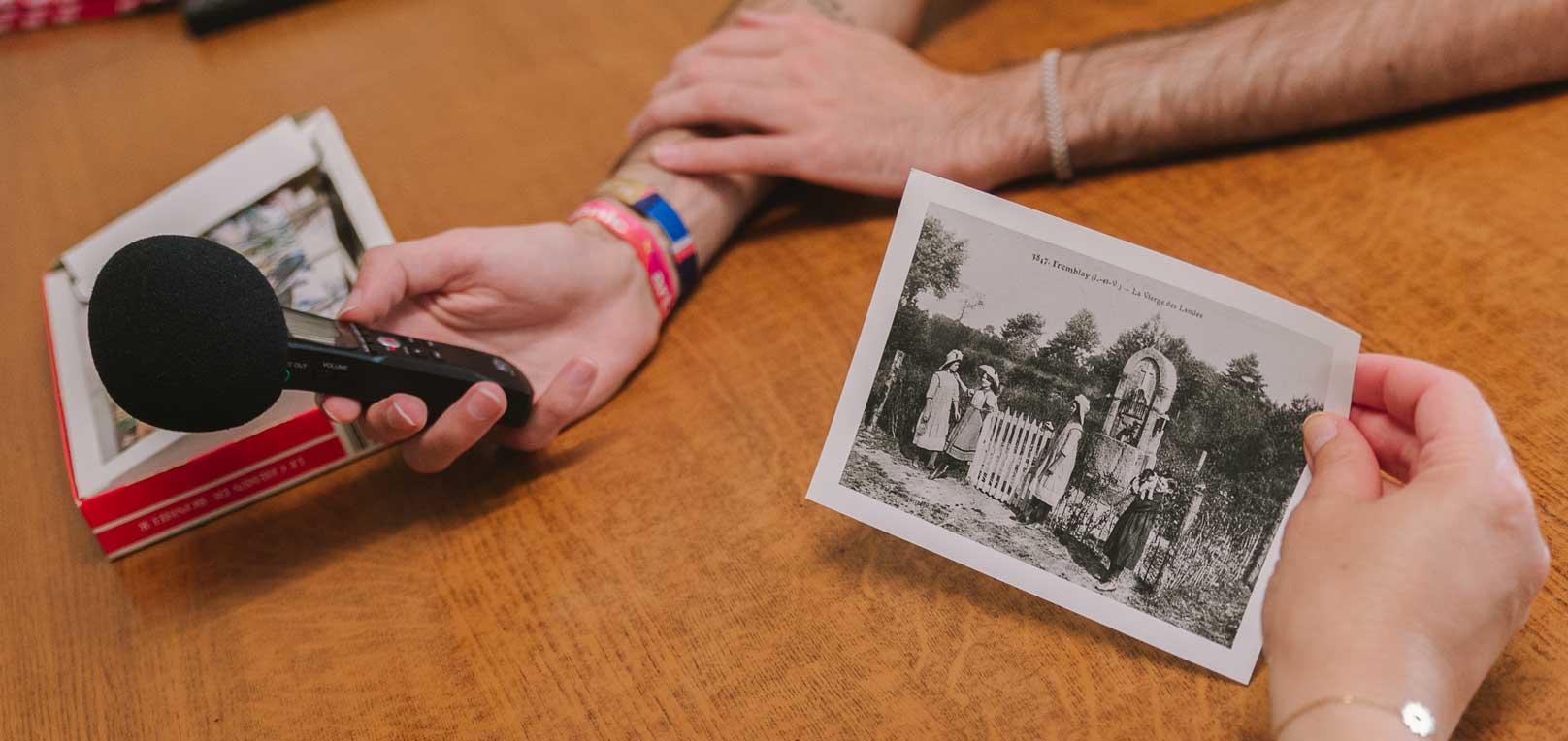 Photo mains avec micro radio et photos anciennes en noir et blanc